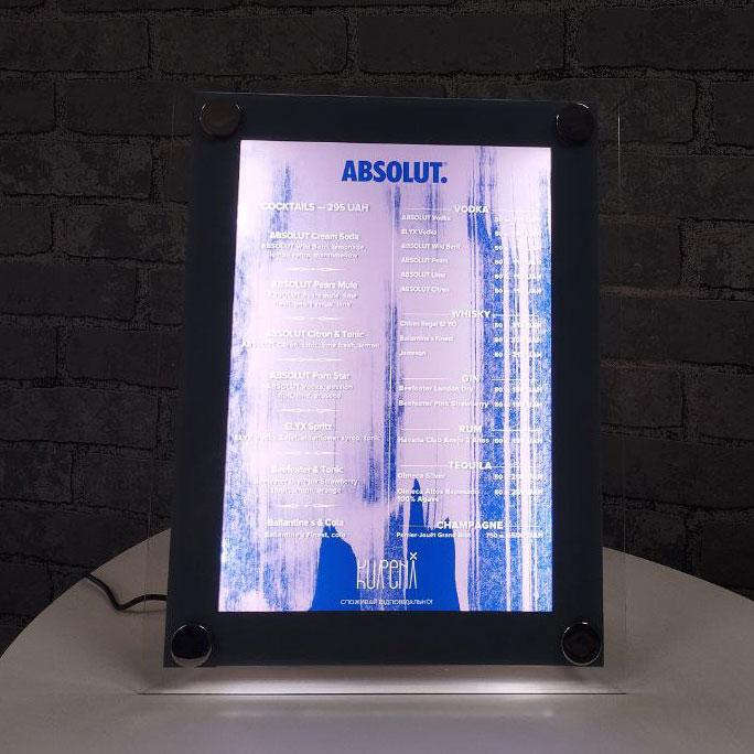 Менюхолдер по типу кристалайта можна використовувати у ресторанах, торгових центрах, на АЗС, у банку, у державних установах тощо. Це універсальний виріб, який може використовуватись і для реклами, і в інших сферах комерційної діяльності.
